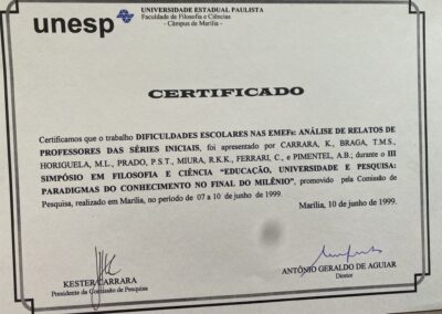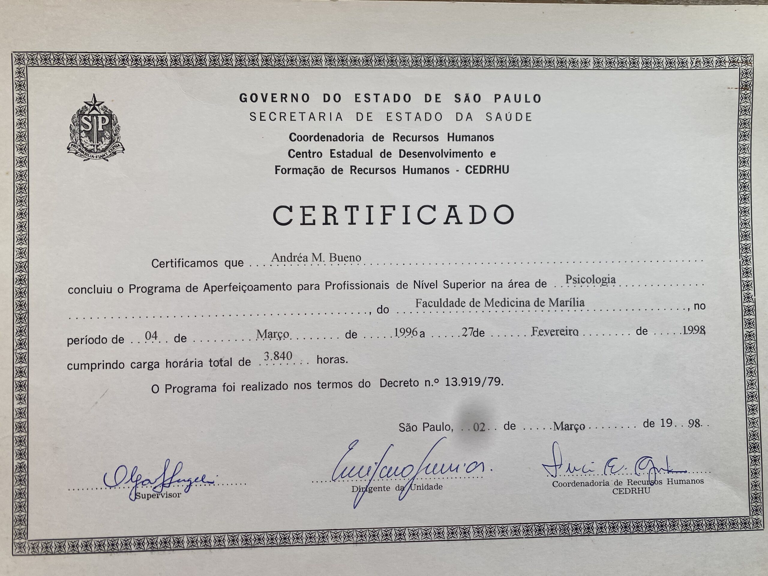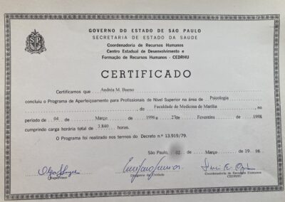 - Aprimoramento Básico de Psicologia em Psiquiatria, promovido pela FUNDAP e Departamento de Psicologia e Psiquiatria da Faculdade de Medicina de Marília – 1998;