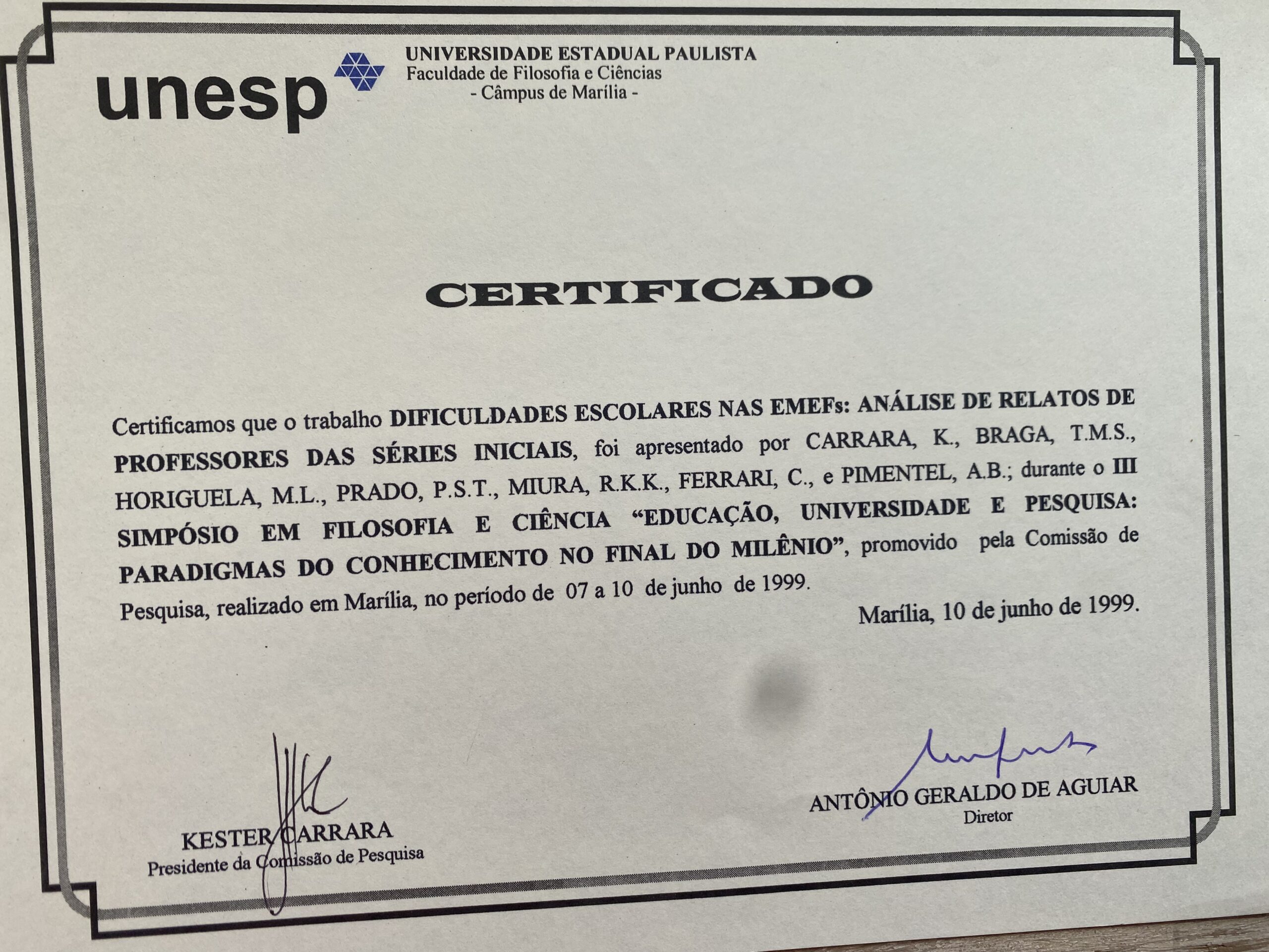 - Mestrado em Psicologia da educação, pela Universidade Estadual Paulista – UNESP- Campus de Marília – Faculdade de Filosofia e Ciências, área de concentração “Ensino na Educação Brasileira”;