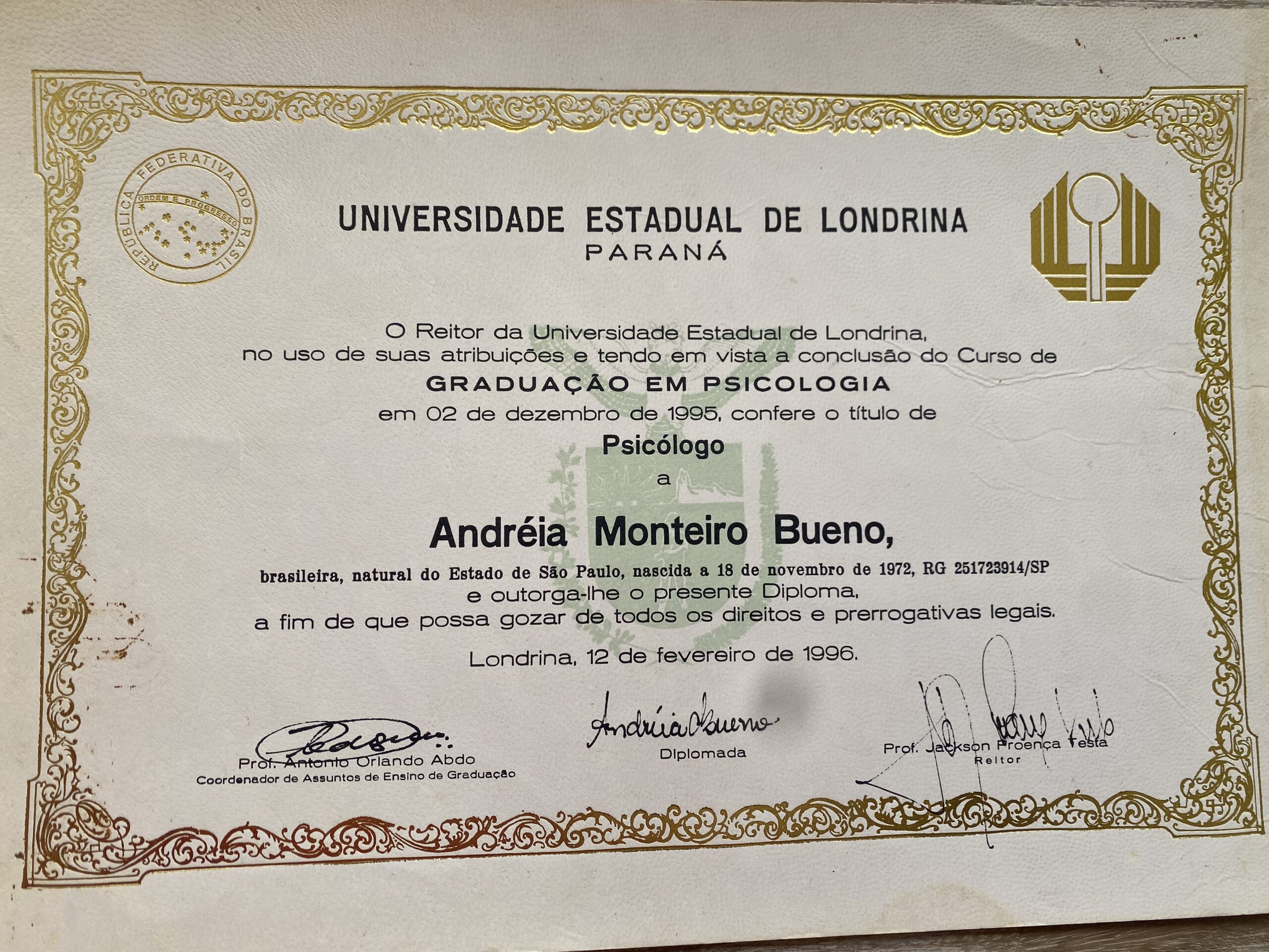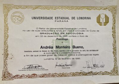 - Graduação em Psicologia, com formação em Bacharelado, Licenciatura e Formação de Psicólogo – Universidade Estadual de Londrina – UEL – 1996;